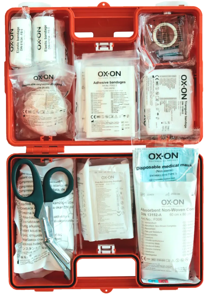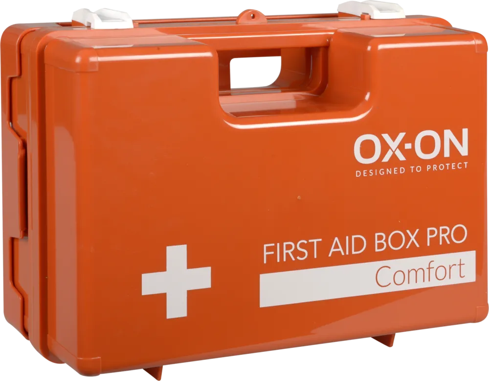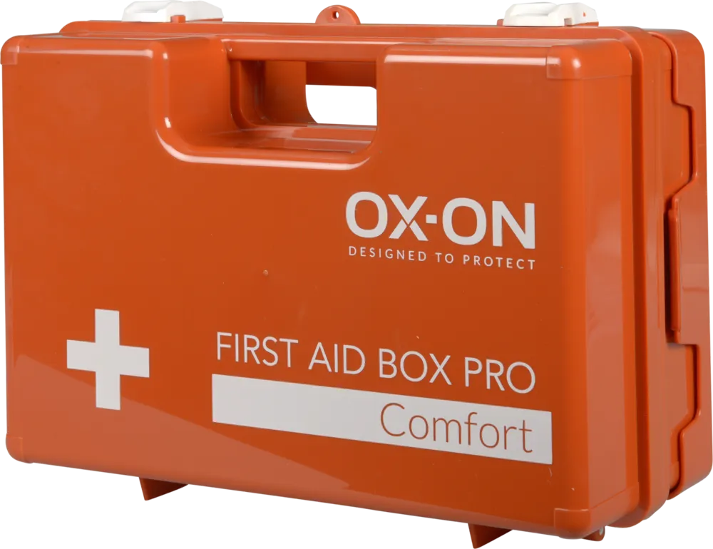 Der OX-ON Erste-Hilfe-Kasten Pro Comfort ist ein professionell zusammengestelltes, unterteiltes Erste-Hilfe-Kit für kleine und mittlere Unternehmen mit 1 bis 50 Mitarbeitern. Die Erste-Hilfe-Box Pro Comfort ist aus schlagfestem ABS-Material gefertigt, so dass sie der Norm DIN 13157 entspricht. Mit dem Erste-Hilfe-Kit erhalten Sie alles, was Sie brauchen, um bei einem Unfall oder Zwischenfall erste Hilfe zu leisten. Das Kit wird mit einer praktischen Wandhalterung geliefert, mit der es gut sichtbar und leicht zugänglich aufgehängt werden kann. OX-ON Erste-Hilfe-Box Pro Komfort enthält: