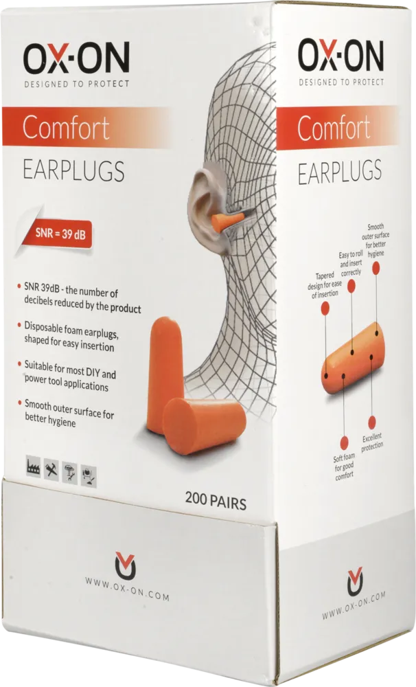 Mit den OX-ON Disposable Earplugs Comfort erhalten Sie ergonomisch geformte Gehörschutzstöpsel aus einem extrem komfortablen PU-Schaum und hoher Qualität. Die OX-ON Earplugs Comfort haben außerdem eine sehr hohe Dämmwirkung (SNR Wert) von 39 dB. Hochfrequenz: 38 dB, Mittelfrequenz: 37 dB, Niederfrequenz: 35 dB. 200 Tüten mit je 1 Paar pro Box.