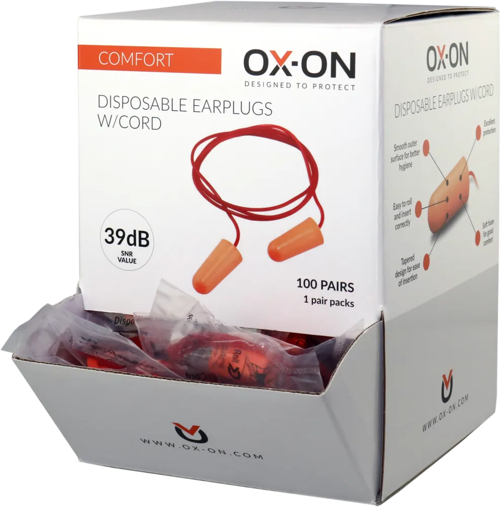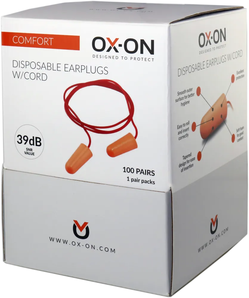 OX-ON Disposable Earplugs w/Cord Comfort, 100 pairs ist eine Box mit 100 Paar Einweg-Ohrstöpseln in Einheitsgröße mit Kordel, paarweise verpackt in Beuteln mit einem Barcode auf jedem einzelnen Beutel. Mit den OX-ON Disposable Earplugs w/cord Comfort erhältst du einen ergonomisch geformten Ohrstöpsel aus äußerst komfortablem und hochwertigem PU-Schaum. Das Design und das Material gewährleisten, dass sich der Stöpsel immer perfekt an deinen Gehörgang anpasst. Die konische Form des Ohrstöpsels macht ihn benutzerfreundlich und einfach einzuführen. PU ist zudem ein sehr hygienisches Material, da es eine glatte und schmutzabweisende Oberfläche hat. Die OX-ON Earplugs w/cord Comfort bieten außerdem einen besonders hohen Dämmwert (SNR-Wert) von 39 dB. Hohe Frequenz: 38 dB Mittlere Frequenz: 37 dB Niedrige Frequenz: 35 dB.