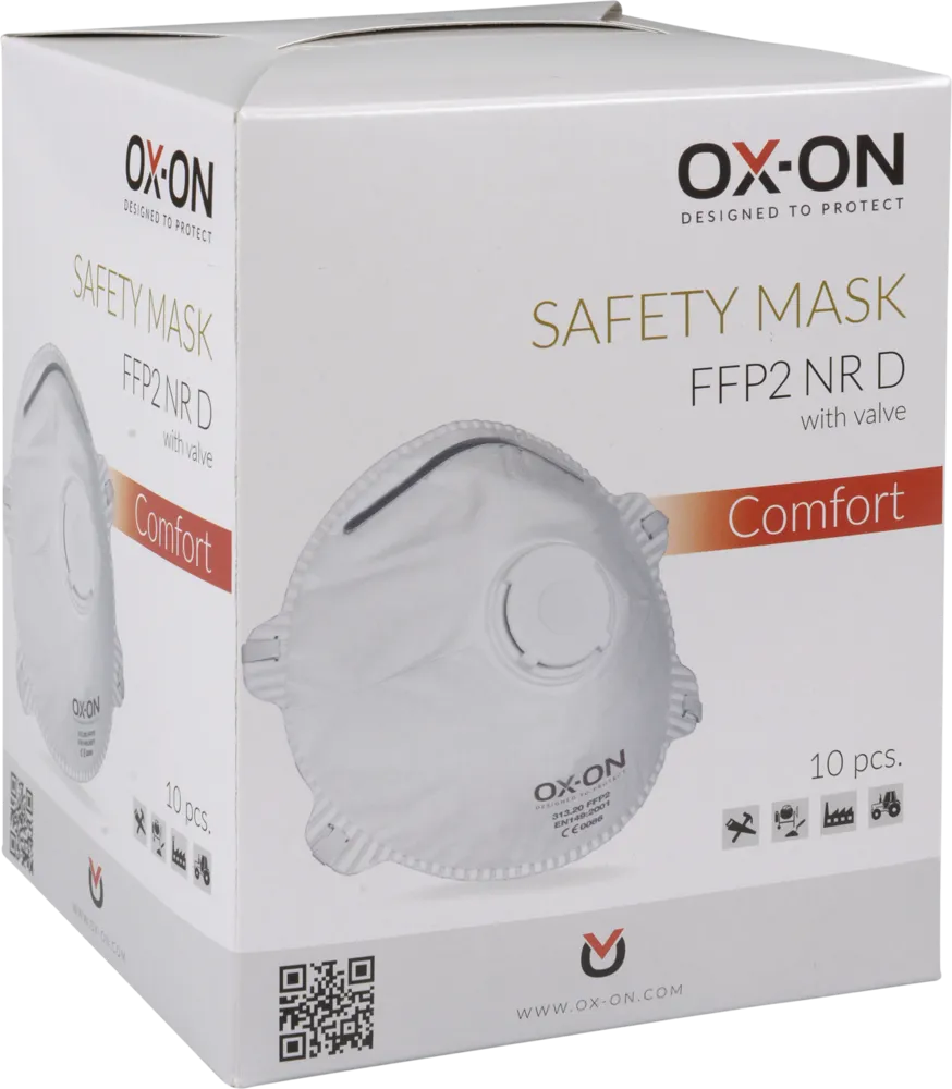 Die OX-ON Mask FFP2NR D w/Valve Comfort ist eine sicherheitsgeprüfte Atemschutzmaske mit Ventil, für Arbeiten mit gesundheitsgefährdenden, trockenen Partikeln und Aerosolen mit einem Grenzwert von <5 mg/m3. Sie können diese Einwegmaske z. B. für Schleifarbeiten an Holz, Metall, Stein und Kunststoff, sowie Arbeiten mit blei- / kupferfreien Farben sowie Farbsprühen mit Farben auf Wasserbasis nutzen. In die Maske ist ein Ventil eingebaut, um Feuchtigkeit und Wärme in der Maske zu reduzieren. Der formbare Nasenbügel sorgt für optimale Anpassung der Maske im Nasenbereich. 10 Masken pro Box.