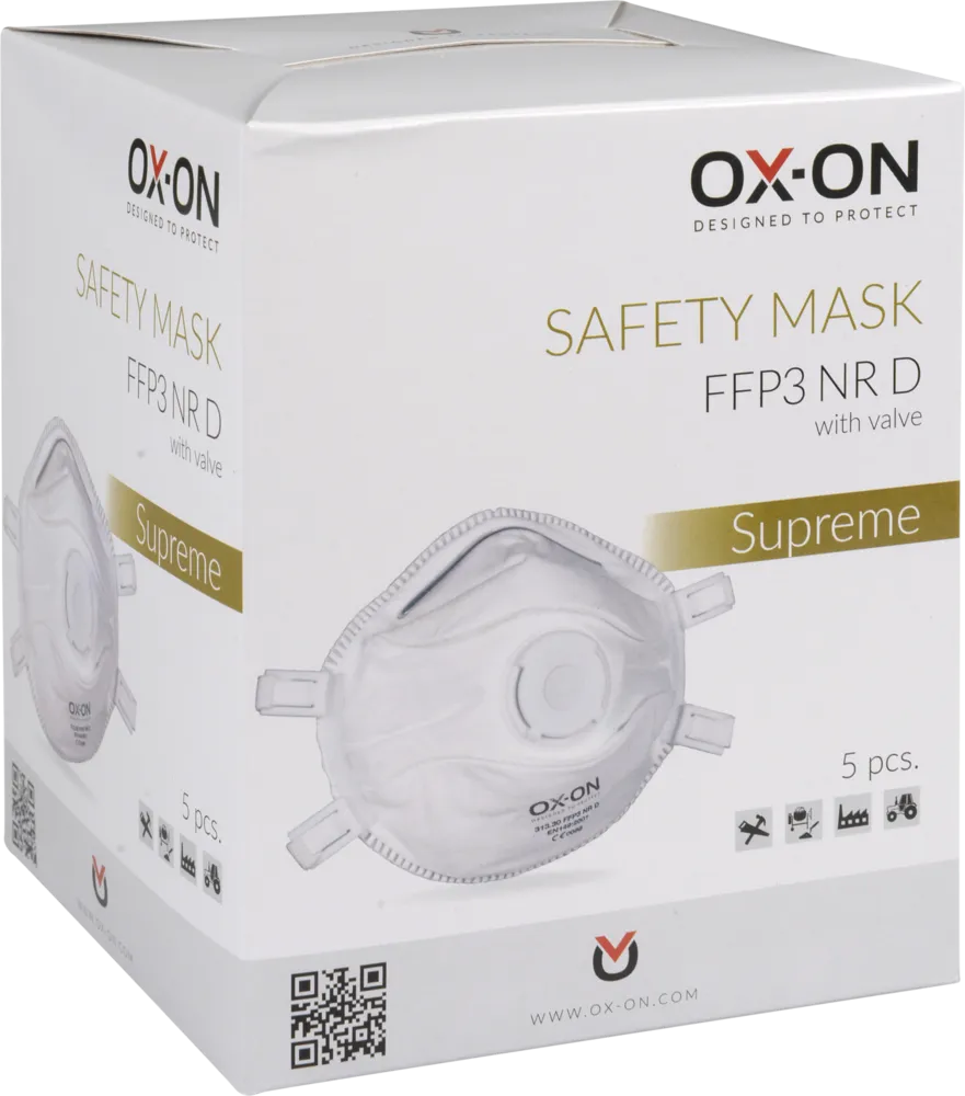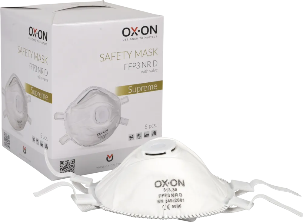 Die OX-ON Mask FFP3NR D w/Valve Supreme ist eine sicherheitsgeprüfte Atemschutzmaske mit Ventil, für Arbeiten mit gesundheitsgefährdenden, trockenen Partikeln und Aerosolen mit einem Grenzwert von <5 mg/m3. Die Maske kann u.a. verwendet werden, wenn Sie mit Zement, Kalk, Asbest, Natronlauge, Schweißdämpfen sowie Bakterien, Pilzsporen und Viren arbeiten. In die Maske ist ein Ventil eingebaut, um Feuchtigkeit und Wärme in der Maske zu reduzieren. Der formbare Nasenbügel sorgt für optimale Anpassung der Maske im Nasenbereich. 5 Masken pro Box.