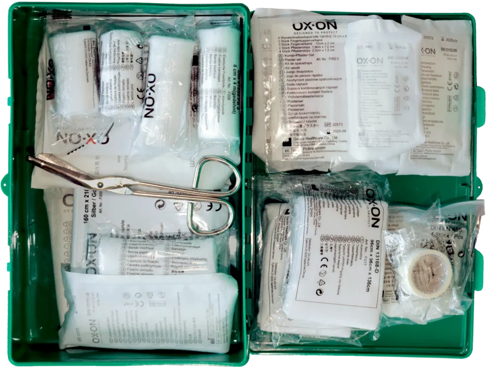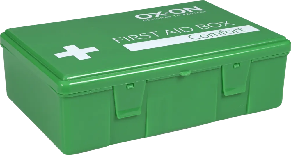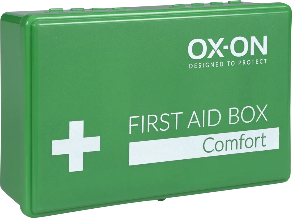 Die OX-ON First Aid Box Comfort ist ein Erste-Hilfe-Kasten für alle, die sicher sein wollen, dass sie Erste-Hilfe leisten können- egal wo sie sind. Dieser praktische Kunststoffkasten enthält die wichtigsten Verbandsmittel, die Sie bei großen und kleinen Unfällen benötigen. Die OX-ON First Aid Box Comfort ist z. B. für Bauwagen, Sommerhaus oder Auto. Enthalten:
